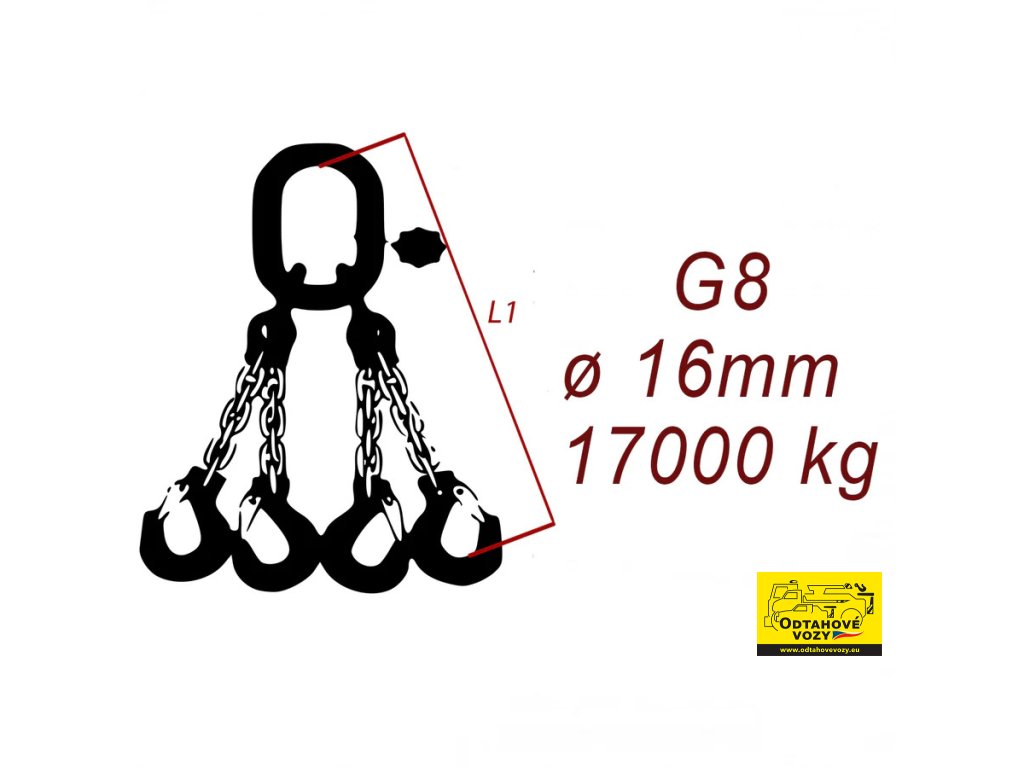 Vázací řetěz třídy 8 čtyřpramenný, oko-hák, průměr 16mm, nosnost 17000kg