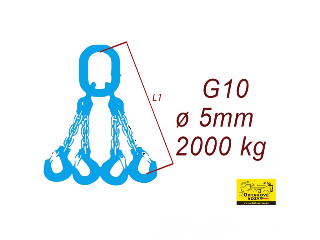 Vázací řetěz třídy 10, čtyřpramenný, oko-hák, průměr 5mm, nosnost 2000kg