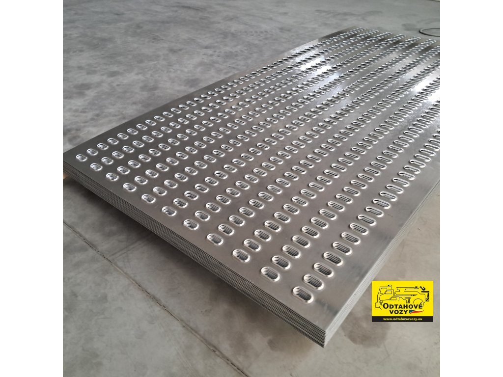 Perforovaný pojezdový plech LOHR z oceli tl. 3 mm žárově zinkovaný pro stavby a opravy odtahových nástaveb, přívěsů a odtahových automobilů. Děrování s prolisovanými krčky zajišťuje vysokou protiskluznost a umožňuje snadné uchycení upínací techniky a klínů (kompatibilní se systémem Kässbohrer). Kromě sériových rozměrů provádíme i zakázkovou výrobu (rovné plechy nebo s bočními ohyby)