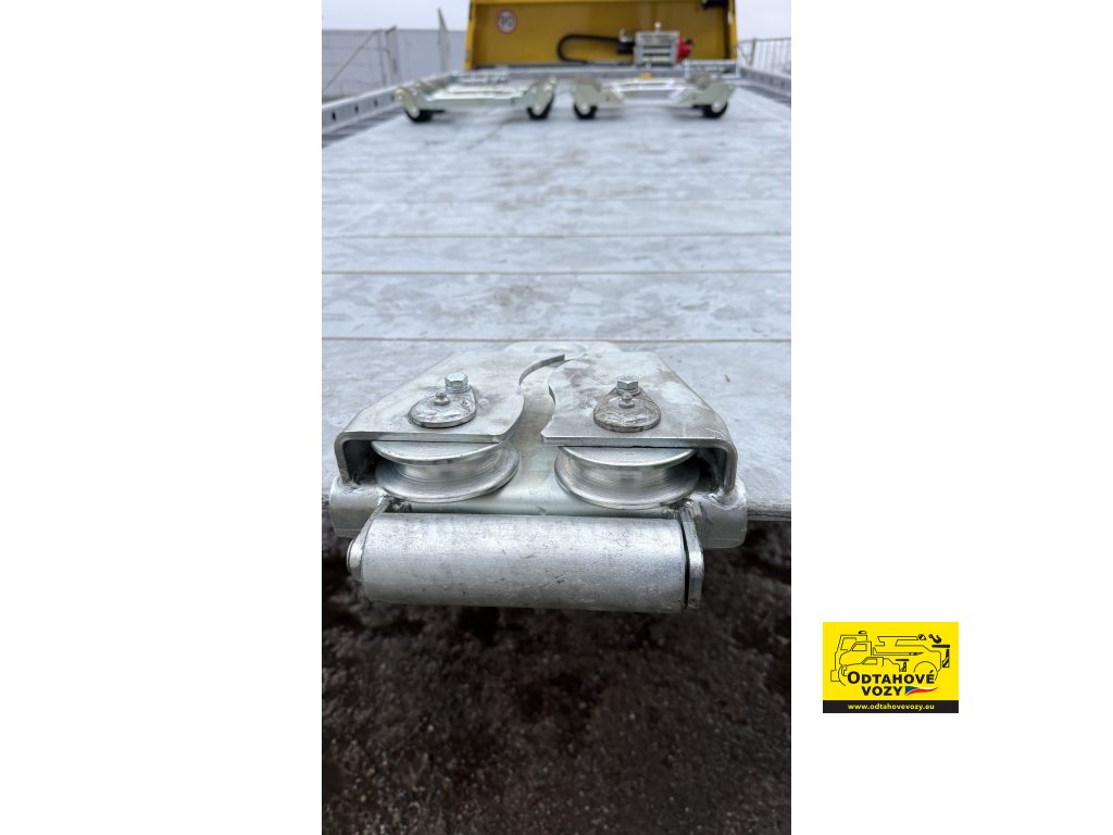 Základem je pomocný rám a samotná plošina, které prošly kompletním procesem pozinkování. To zaručuje, že i po letech provozu v soli a blátě bude konstrukce odolávat korozi. Plošina o délce přibližně 6300 mm a šířce 2450 mm je segmentové konstrukce s hladkými boky z kazet. Pohyb plošiny zajišťuje výsuvný válec o délce 3600 mm, přičemž samotný posun je realizován na teflonových kluzácích. Toto technické řešení zajišťuje tichý chod, minimální opotřebení a plynulost pohybu i při plném zatížení, které u tohoto Mercedesu ATEGO 1223 činí úctyhodných 6000 kg.