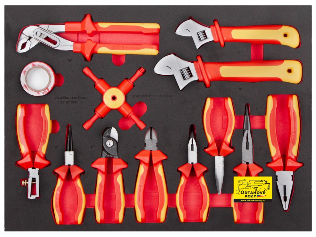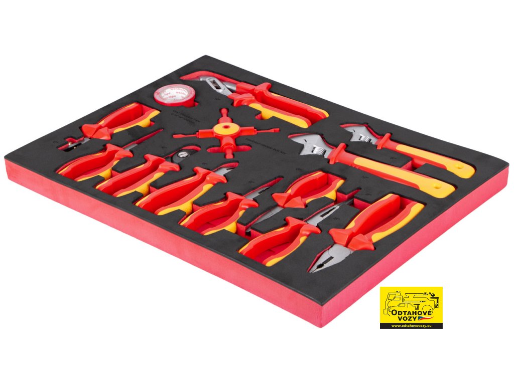 Univerzální sada izolovaného VDE nářadí pro práci s vodiči a elektrickými rozvody, uložená v praktické pěnové výplni do zásuvky dílenského vozíku.