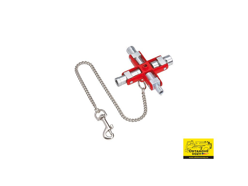 Pro uzavírací systémy v elektrotechnice, plynoinstalace a vodoinstalace, klimatizační a odvzdušňovací techniku, průmysl, techniku budov atd.. 9 různých zakončení ze zinkového tlakového odlitku v jednom klíči. S odnímatelným řetězem a karabinou. Celková délka ramene: 90 mm. Zinkový tlakový odlitek.